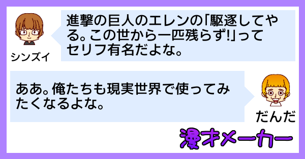 進撃の巨人のエレンの「駆逐してやる。この世から一匹残らず!」ってセリフ有名だよな。