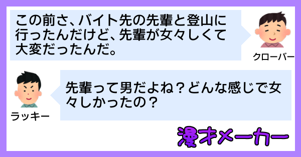 この前さ、バイト先の先輩と登山に行ったんだけど、先輩が女々しくて大変だったんだ。